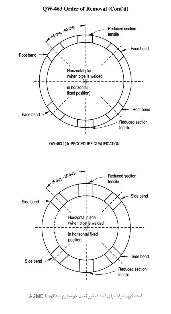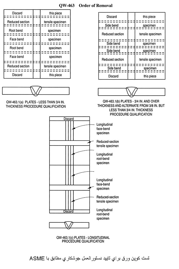 شکل نمونه آزمون (ورق، لوله و ...) انتخابی است. تأیید نهایی PQR بر اساس نمونه آزمون لوله باعث تائید جوشکاري بر روي ورق خواهد بود و برعکس. نوع و تعداد نمونه ها براي جوش شیاري باید با مقادیر ذکر شده در استاندارد ( QW-451 ).